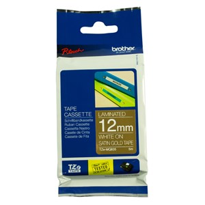 Brother TZE-MQ835 DECO Tape White On Satin Gold 12mm x 5M Matt Laminiation TZE Tape